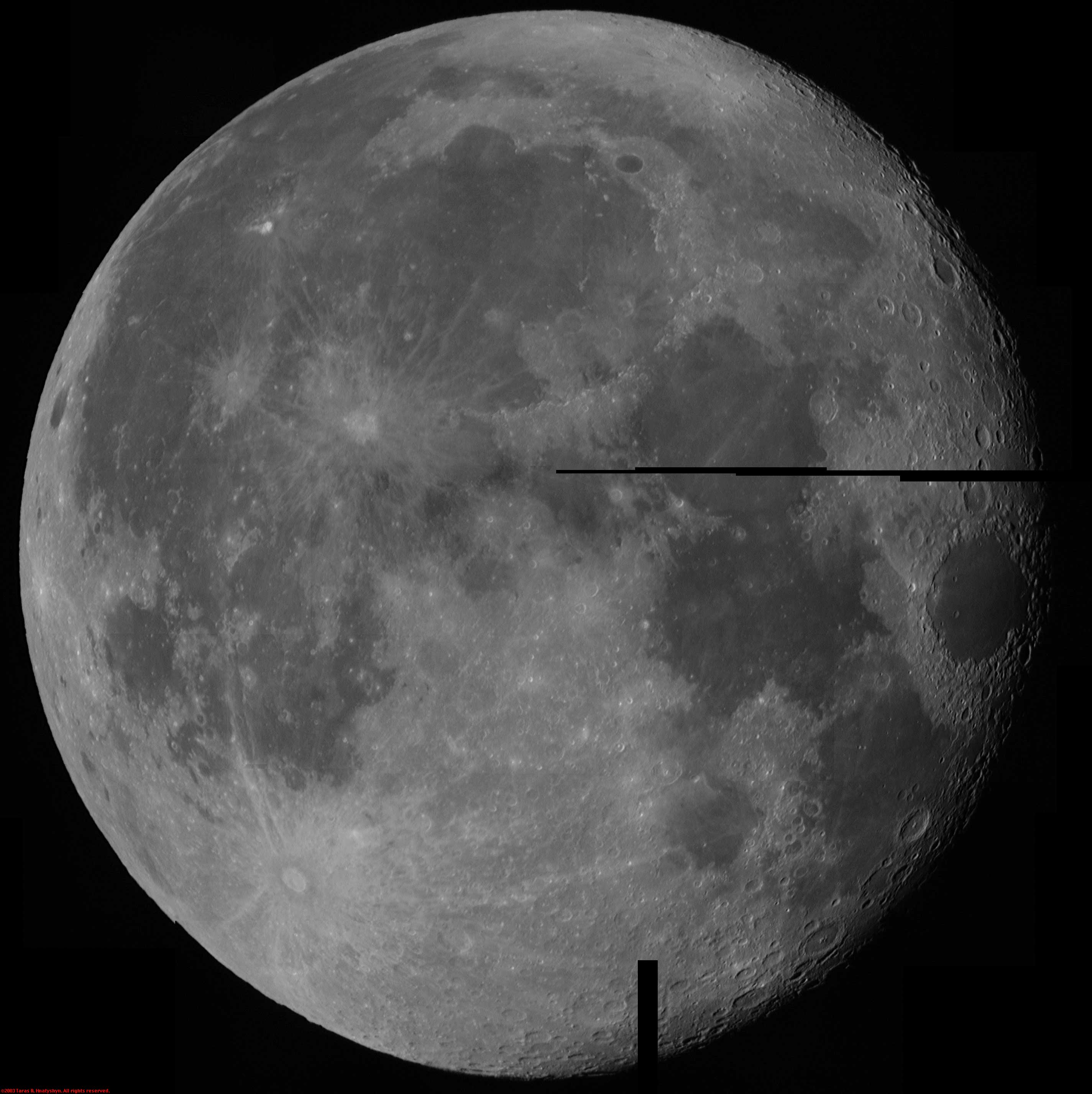 Images from videos taken using my 600 MHz iBook with an OrangeMicro iBot FireWire CCD webcam using BTV Pro mounted with a Mogg webcam adapter on an 127mm f/14.96 Meade ETX125AT Maksutov-Cassegrain Telescope with a Scoptronix visual back at about 1:00 AM on August 14, 2003 in New York, NY. Each of the individual images were registered in Adobe Photoshop 7. To see the full size mosaic (JPEG-348 kB) click here. The gain and shutter were set to manual so that the exposures would be consistent. There are a few gaps in the mosaic because my ETX125 still has a bit of backlash. Phase: 95.32 %