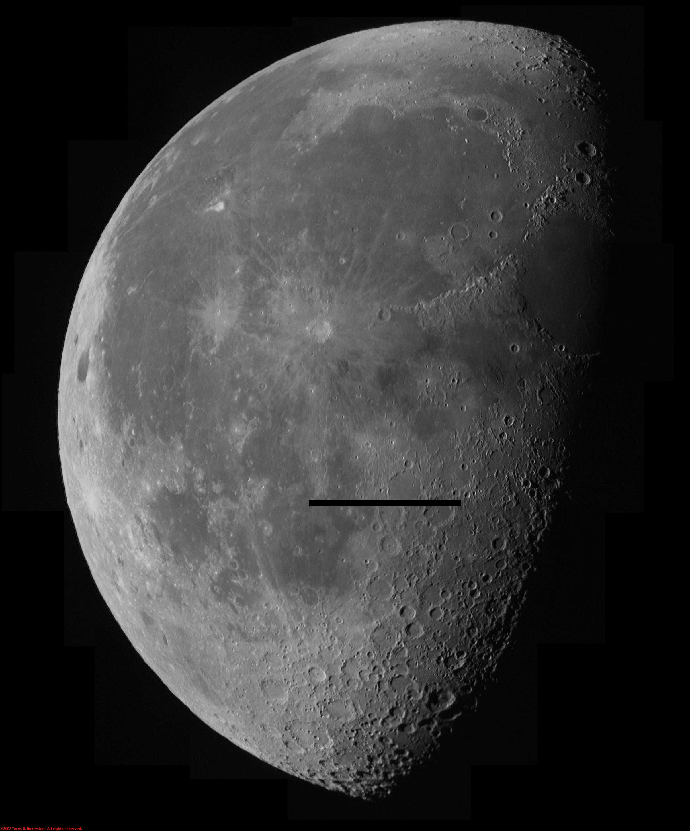 Images from videos taken using my 600 MHz iBook with an OrangeMicro iBot FireWire CCD webcam using BTV Pro mounted with a Mogg webcam adapter on an 127mm f/14.96 Meade ETX125AT Maksutov-Cassegrain Telescope with a Scoptronix visual back at about 1:50 AM on August 18, 2003 in New York, NY. Each of the individual images were registered in Adobe Photoshop 7. To see the full size mosaic (JPEG-316 kB) click here. The gain and shutter were set to manual so that the exposures would be consistent.