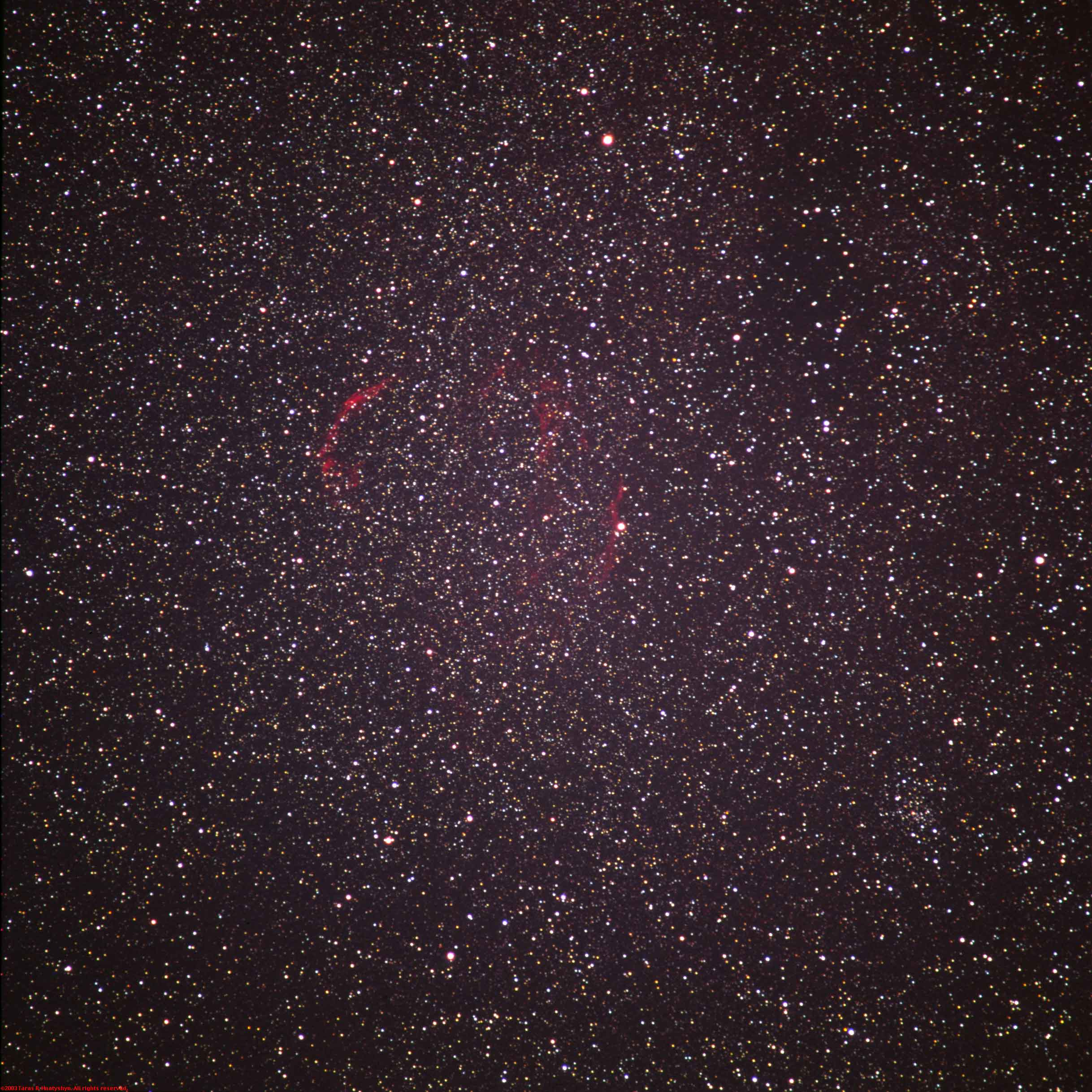 | | Veil Nebula (NGC 6995, NGC 6992, NGC 6979, NGC 6974, NGC 6960) Manually guided photo taken on Kodak Ektachrome E200 film with an exposure of 30 minutes with a Hasselblad 500C/M camera with a Zeiss Tele-Tessar 350mm f/5.6 C T* lens at full aperture mounted on a classic 203.2mm f/6.3 Meade LX200 Schmidt-Cassegrain telescope with Losmandy rail and camera mount at 12:33 AM on August 28, 2003 in Ellenville, NY. The transparency was scanned on a Minolta Scan Multi II at 1128 dpi. The image was processed in Photoshop 7 on my 467 MHz Power Macintosh G4. For the full size version (388 KB) click here. |